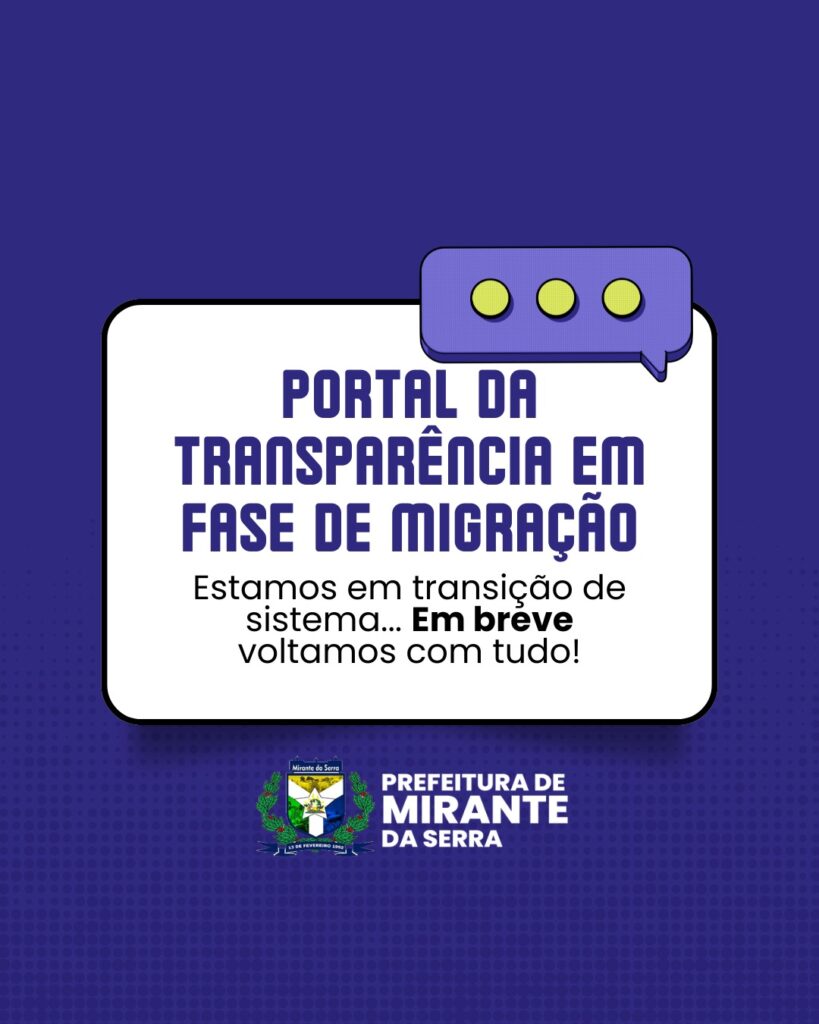 A Prefeitura Municipal de Mirante da Serra – RO informa à população que o nosso Portal da Transparência está passando por um processo de migração para uma nova plataforma, com o objetivo de implementar melhorias e oferecer uma experiência mais eficiente e acessível aos cidadãos. Durante esse período de transição, estimado em aproximadamente 15 (quinze) dias, algumas publicações poderão ficar temporariamente indisponíveis. Contamos com a compreensão e paciência de todos e reforçamos nosso compromisso com a transparência e a qualidade das informações públicas.