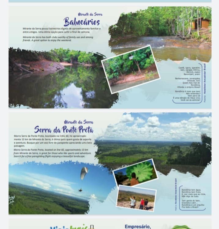O Município de Mirante da Serra entrou na rota do turismo do Estado de Rondônia.Em destaque os Balneários e a Serra da Ponte Preta, localizada na linha 60.