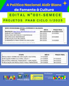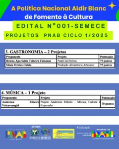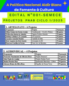 SEMECE RESULTADO SELEÇÃO DE PROJETOS CULTURAIS – POLÍTICA NACIONAL ALDIR BLANC PNAB Leia Mais > 8 de dezembro de 2025 17:59
